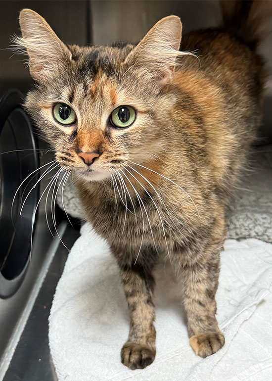 This lovely lady is dressed to impress in her gorgeous tortoiseshell-tabby coat, complete with a long, full, fluffy tail that adds to her undeniable charm. Kiwi is a big fan of head rubs, tasty treats, and finding the perfect cozy spot to curl up for a nap. She was found as a stray and brought to the shelter by a kind member of the community, and now she’s ready to find a loving home of her own.